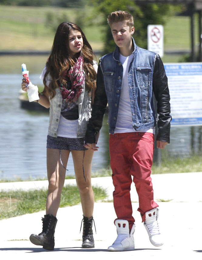 Selena Gomez y su novio Justin Bieber visitan Bronco Burrito para el almuerzo con un amigo antes de ir a Lake Balboa para disfrutar de un paseo alrededor del lago, mientras comen un helado en Van Nuys, California el 30 de junio de 2012.